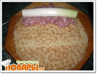 На блин выкладываем измельченное мясо и вареную морковь, сворачиваем в тугой рулетик. На второй блин кладем мясо+ лук порей - тоже соврачиваем в рулетик И на третий блин выкладывем майонез, резаную зелень, чеснок , мясо и брусочки сыра - скручиваем Раскладываем кожу, на нее выкладываем отбитую грудку. Солим, перчим. Выкладываем рулетики горкой и сворачиваем в один большой рулет