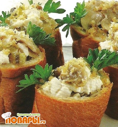 Рогалики разрежьте на 3 части, удалив предварительно кончики, чтобы получились стаканчики высотой 2-2,5 см. Выньте мякиш, натрите его на терке и обжарьте на части масла, чтобы получились хрустящие крошки.