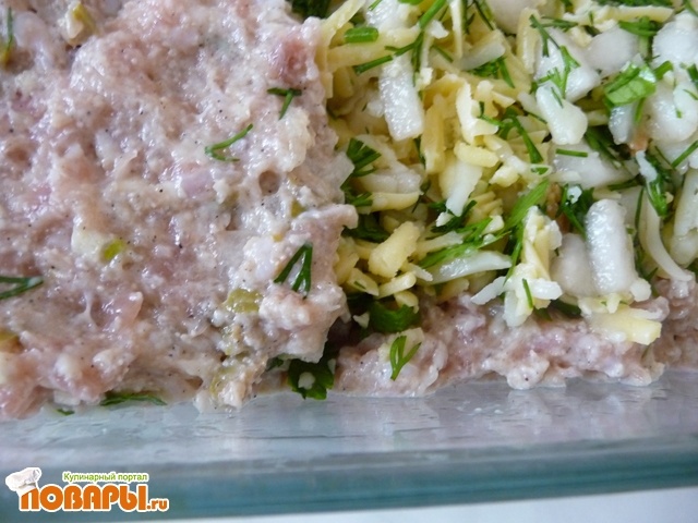 В форме для запекания выкладываем 3/4 частью фарша дно и бока. На фарш выложить начинку и накрыть оставшимся фаршем.