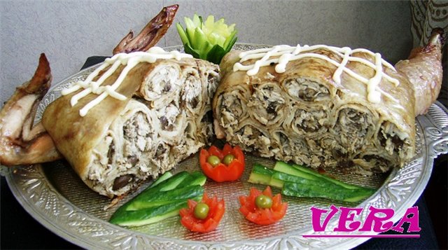 Уложить блины как можно плотнее в кожу, отверстие закрепить зубочисткой. Поставить в разогретую духовку (180 градусов) на 30 минут.