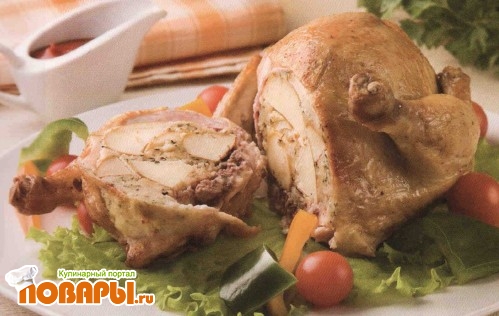 Нафаршируйте курицу полученной начинкой, зашейте брюшко. Натрите курицу снаружи порошком карри, жарьте в духовке до готовности, периодически переворачивая. Подавайте с листьями зеленого салата и свежими овощами.