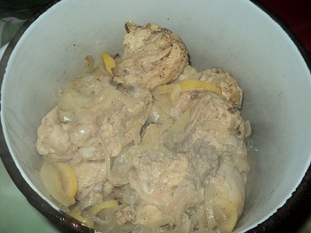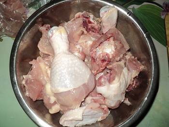 Курицу осмалить от оставшихся перышек, при желании снять кожицу, хорошо промыть и обсушить бумажным полотенцем. Разделать на небольшие кусочки.