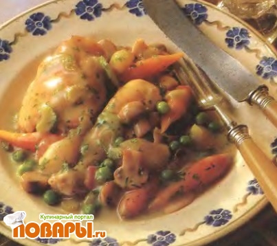 Сочетание петрушки, лаврового листа и душистой гвоздики придает этому легкому блюду тонкий аромат. Грибы, морковь, нежный горошек и сочное куриное мясо выглядят еще аппетитнее под хересовым соусом.
