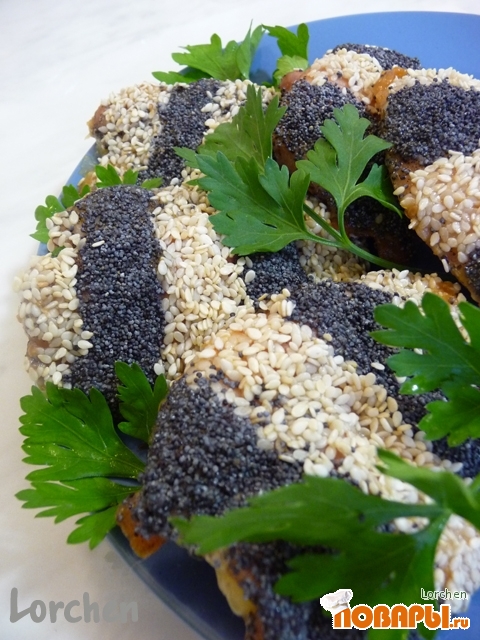 Филе смазать взбитым яйцом и посыпать полосками (около 2 см) кунжутом и маком.