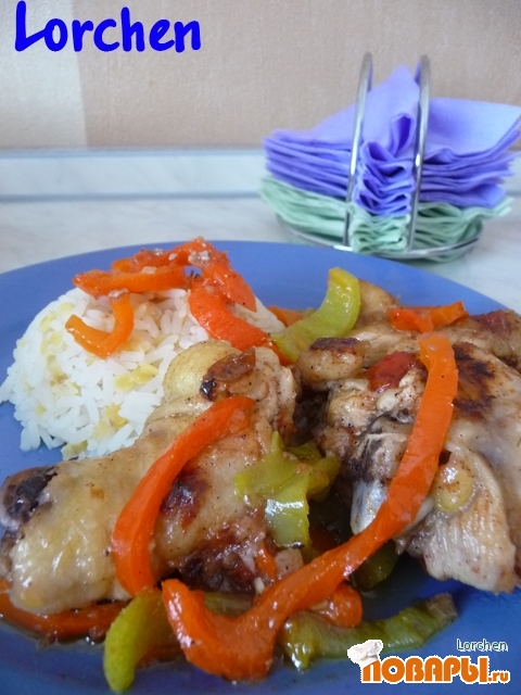 Сладкий перец очистим от кожицы и порежем нетонкой соломкой, добавим к курице и все вместе потушим еще минут 15.