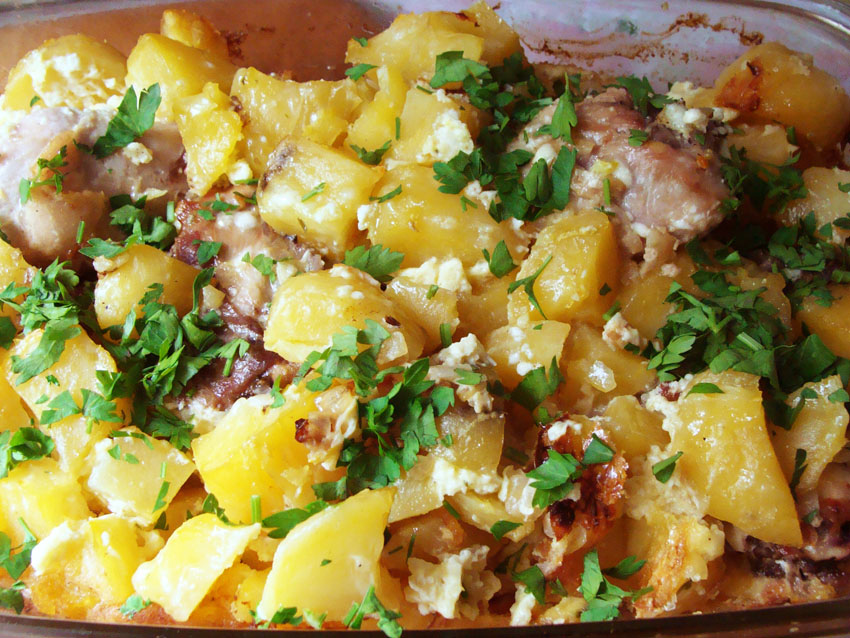 Картофель (если он старый то его лучше отварить в "мундире", чтобы потом было легче чистить), порезать на кубики и добавить к окорочкам. Потушить мелко нарезанный лук в том же масле, где жарились окорочка и добавить в форму.