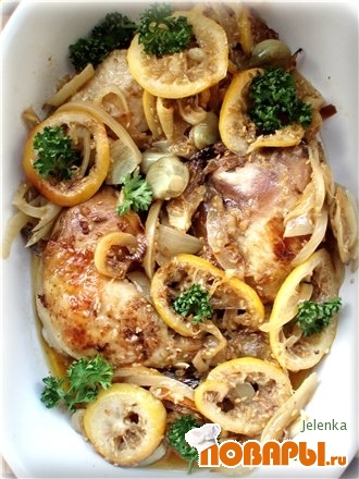 В форму выложить половину порции лимона, лука, зубчиков чеснока. сверху положить курицу и выложить остальные продукты.