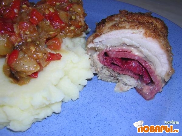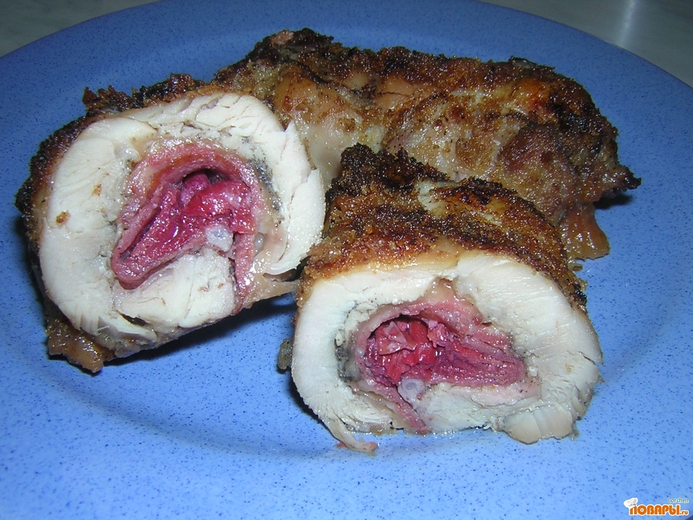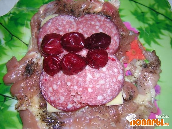Окорочка освободить от костей, не нарушая целосность мяса, филе отбить, посолить, поперчить по вкусу. Положить на мясо кусочки сыра, колбасу и ягоды вишни без косточек.