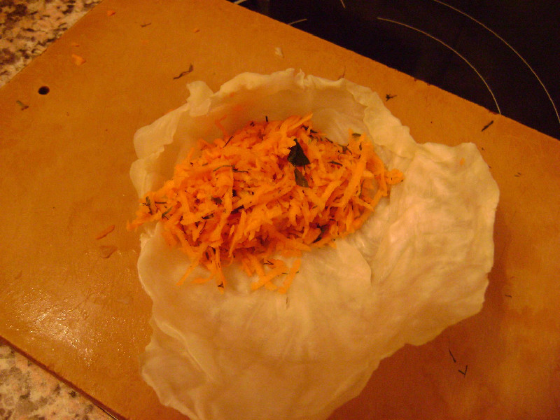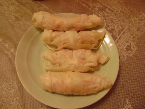 Капусту приготовить как для голубцов (обдать кипятком и разделать на листочки).