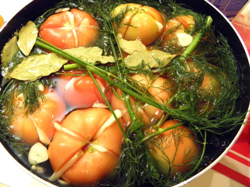 Делаем рассол. На каждый литр воды добавляем 60 г соли. Укладываем помидоры в удобную емкость и заливаем теплым рассолом так, чтобы он покрывал полностью помидоры. Добавляем веточки укропа,