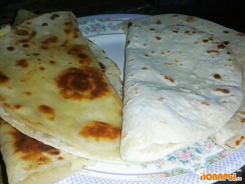 Раскатать из шариков тонкие лепешки. Лепешку обжарить с двух сторон на сухой сковороде, сразу же на одну половину положить пюре и распределить его по всей половине и быстро свернуть пополам. Полить растопленным сливочным маслом. В моем варианте потом каждую лепешку обжарить с двух сторон на сливочном масле. Есть горячими.