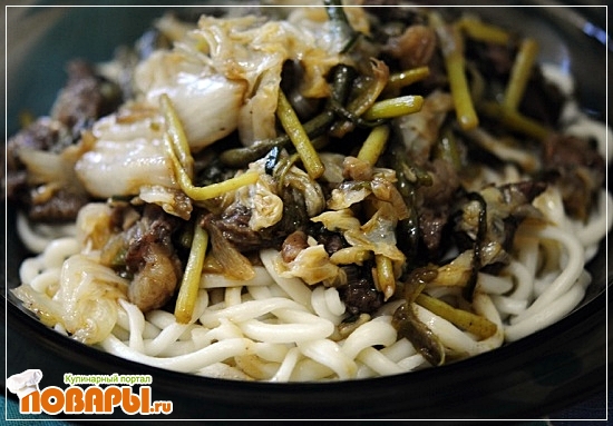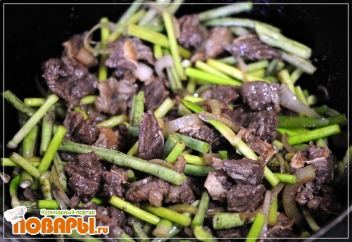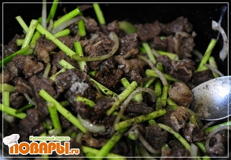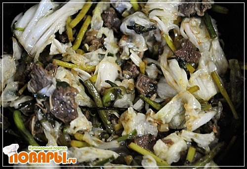 Теперь можно выкладывать к мясу подготовленные продукты: дудки чеснока, джандо, лук, зеленый лук или джусай если есть. Обжариваем минут 20-25