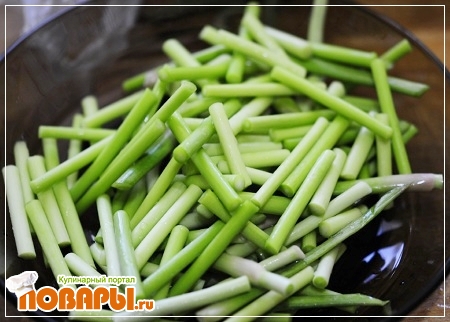 Пока мясо жарится- тушится можно постепенно подготавливать другие продукты. Чесночные дудки помыть и порезать длиной в 5-7 см.
