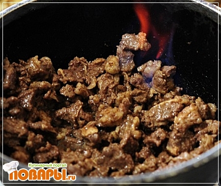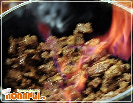 Как только мясо потушилось, а вы все нарезали (подготовили), нужно подготовить мясо для закладки к нему овощей. Мы можем ускорить процесс готовки мяса, особенно если это не теленок а говядина, мы воспользуемся методом фламбирования, т.е. будем создавать пожар.