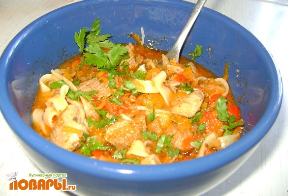 При подаче на стол в глубокую пиалу сначала положить лапшу, на нее слой подлива. Все посыпать мелко порубленной кинзой.
