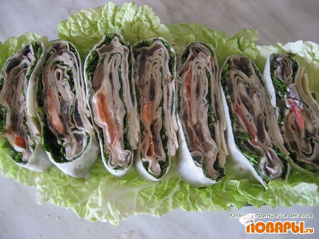 Третий лаваш смазать смесью майонез + чеснок. По центру лаваша выложить тонко порезанный полукружочками помидор.