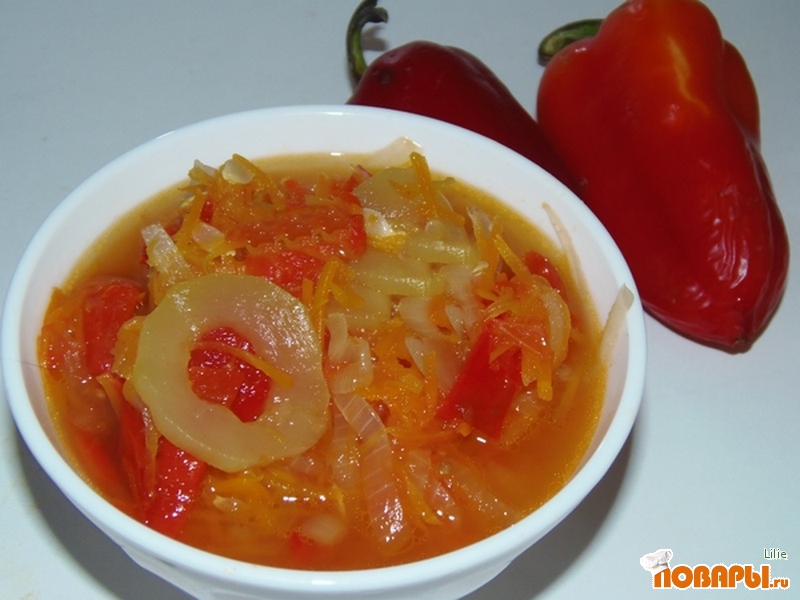 Кабачки и лук чистим и режем кольцами, помидорки - кубиками, перец и морковку - соломкой (морковку для быстроты я терла на терке).