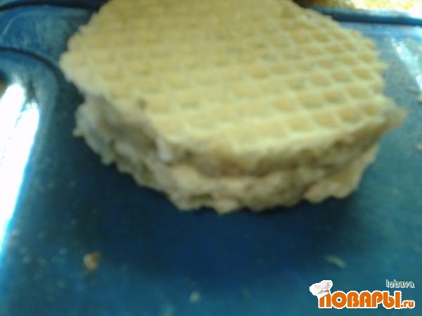 Сверху укладываем вторую вафельку, немного придавив к фаршу. На этом можно остановится, но лучше вновь положить фарш и сверху третью вафельку. Так получится вкуснее и сочнее.