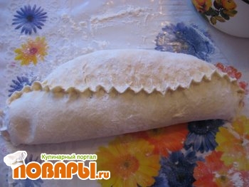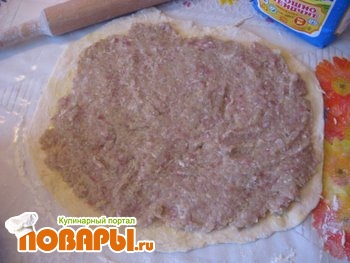 На тесто кладу слой фарша толщиной 1см и заворачиваю все рулетом, защемляю края, чтоб сок не вытек.