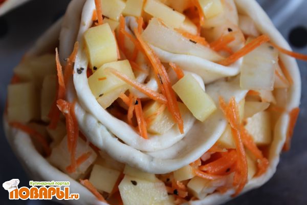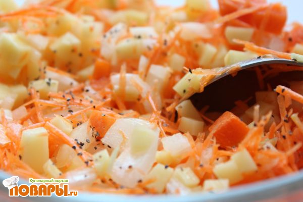 Тесто бросаем в холодильник. Готовим начинку. Морковь трем. Лук и картофель с тыквой кубиками мелкими режем. Картофель можно и натереть, тогда начинка по текстуре будет совершенно отличаться. Я люблю кубиками, например. Так пальцы целее остаются. Все смешиваем в чашке, перчим, НЕ солим, заправляем парой ложек масла растительного.