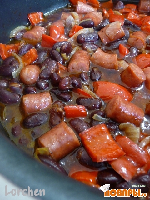 Затем добавить фасоль и крупно порезанные сосиски.