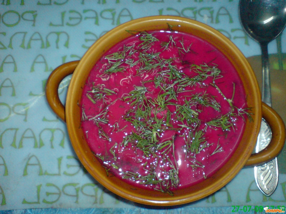 Остудить. Когда свекольник остынет,добавить остальные ингредиенты,предварительно нарезав.Заправить сметаной и поставить в холодильник.Есть охлажденным.