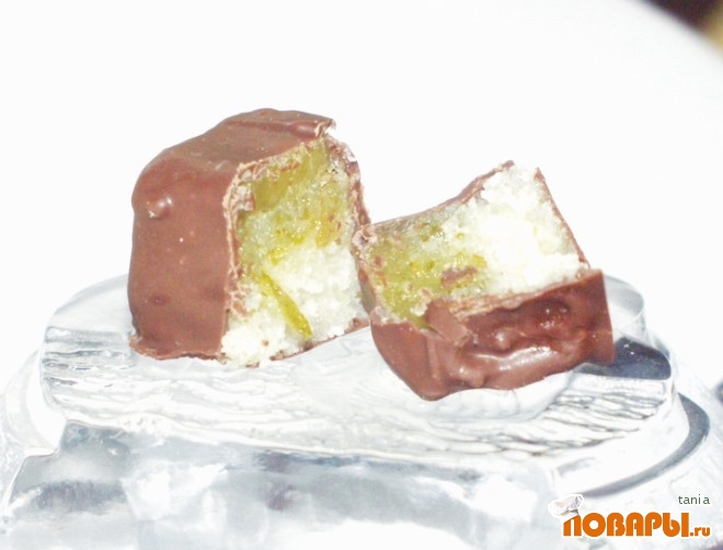 Взять кокосовый слой, снять с него клеенку, сверху положить цукатный слой, а верх намазаь лимонным кремом. Оставить в холодильнике на 48 часов что бы немного подсохло. Нарезать кубиками, обмакнуть каждую конфету в шоколаде.