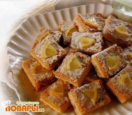 Дайте остыть, разрежьте на квадратики, украсьте ломтиками лимона и посыпьте сахарной пудрой, пропуская ее через ситечко.