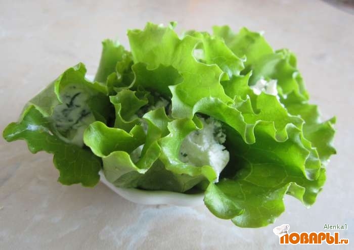 Творожная начинка готова. Дальше берем листок зеленого салата и выкладываем на середину полученную творожную массу.