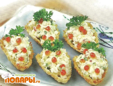 Заполните «лодочки» крабовой начинкой, оформите икрой и зеленью.