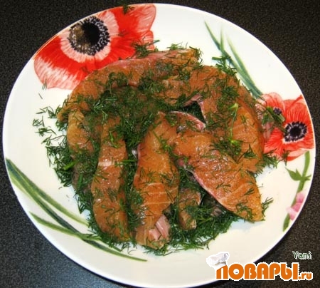 Смешиваем 0,5 ч.л. соли с перцем и мелко порубленным укропом и обваливаем данной смесью кусочки рыбного филе.