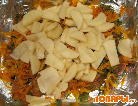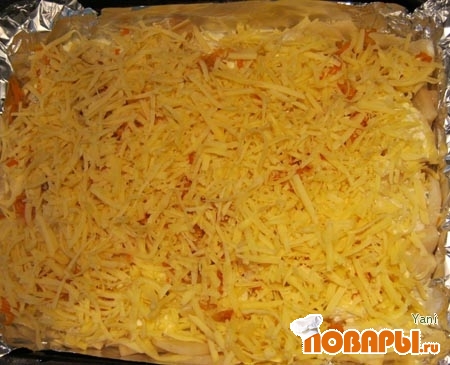 Сливки смешиваем с 1 ч.л. соли, с приправой для рыбы. Поливаем сливочной смесью слой картофеля.