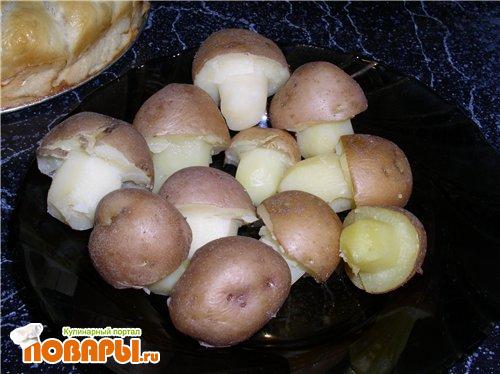 Картофель очень хорошо вымыть щеткой и отварить в кожуре, следить, чтоб он не разварился. Дать ему остыть и аккуратно вырезать с одной половинки ножку грибочка.