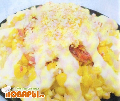 Язык тонко нарезать соломкой и выложить поверх кукурузы. Посолить по вкусу, полить майонезом, обильно посыпать семенами кунжута.