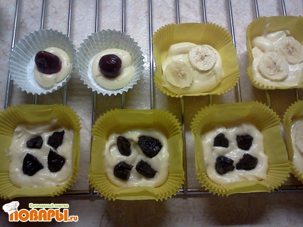 В бумажные формы наливаем по 1/3 теста с помощью кулинарного мешка. Далее выкладываем фрукты. Я использовала вишню, чернослив и банан, но рекомендую только вишню.