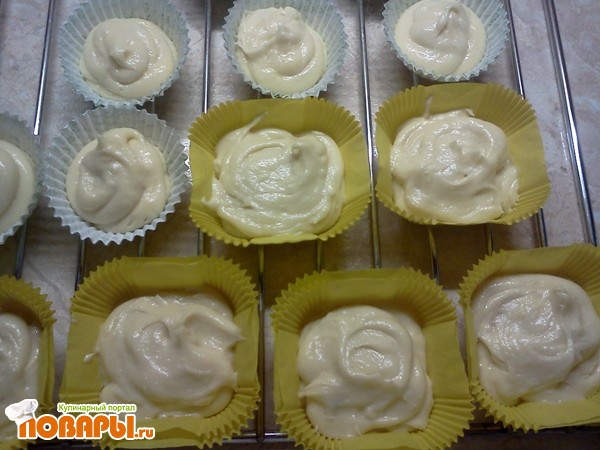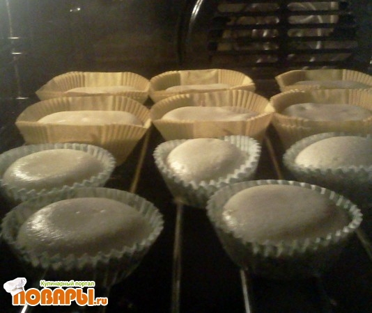 Для выпечки я использовала бумажные формы, по правилам они вставляются в металлические или силиконовые формы для маффинов, но у меня таковых не оказалось, поэтому пришлось для каждого маффина использовать по 3 формочки. Если делаете в бумажных формах, то следите, чтобы тесто не заполняло полностью, иначе все вытечет до того, как запечется. У меня кексы немного потекли, но это их вкуса не испортило.