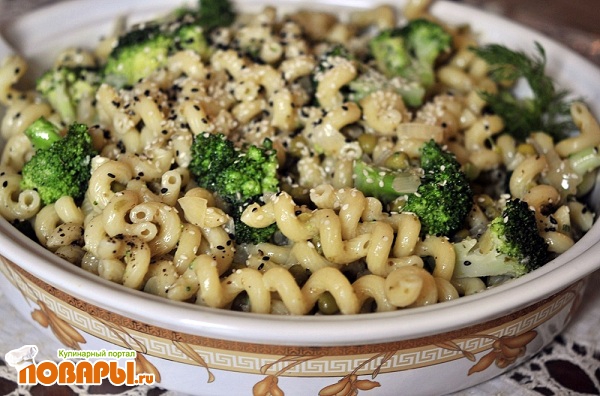 Когда все ингредиенты будут готовы, нужно все собрать вместе. Макароны, брокколи – перемешать. Базиликом с маслом, залить жаренным луком - перемешать. Засыпать горошек.
