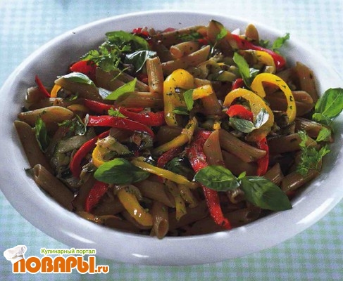 Положите рубленые овощи в сковороду с чесноком и петрушкой, добавьте сок и цедру лимона, посолите, перемешайте и прогрейте. Макароны откиньте на дуршлаг, встряхните и положите в сковороду с соусом. Перемешайте и разложите по подогретым тарелкам. Подавайте немедленно, поставив на стол оливковое масло и мельницу с перцем.