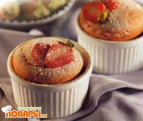 Смажьте сливочным маслом и посыпьте сахарной пудрой формочки для суфле. Распределите по ним клубничный крем, заполняя каждую формочку на 2/3, и поставьте на 18-20 минут в нагретую как минимум 15 минут до выпекания, ни разу не открывая дверку духовки.