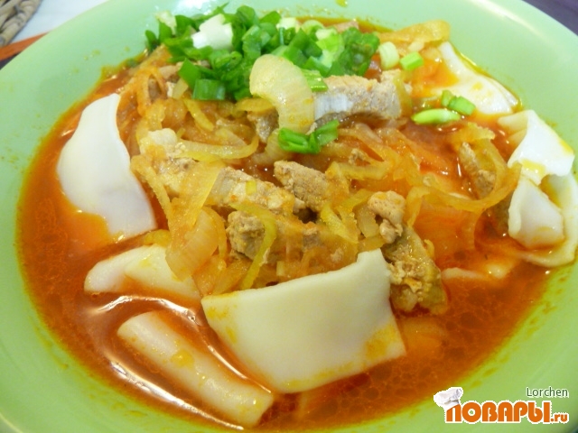 Залить водой (бульоном), посолить и довести до кипения. Добавить мелко нарезанный чеснок.