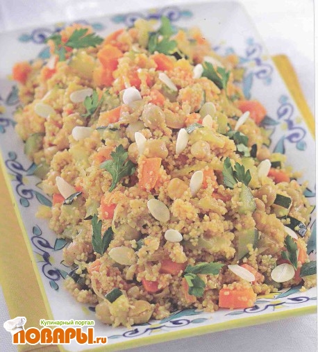 Перемешайте рагу с кускусом, посыпьте листиками петрушки и миндальными хлопьями.