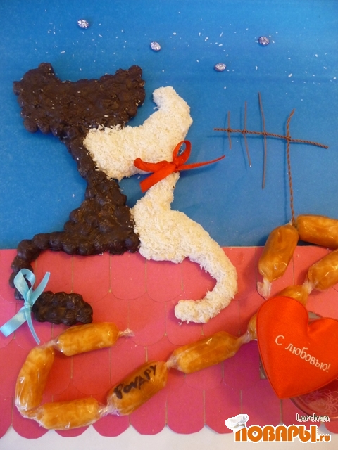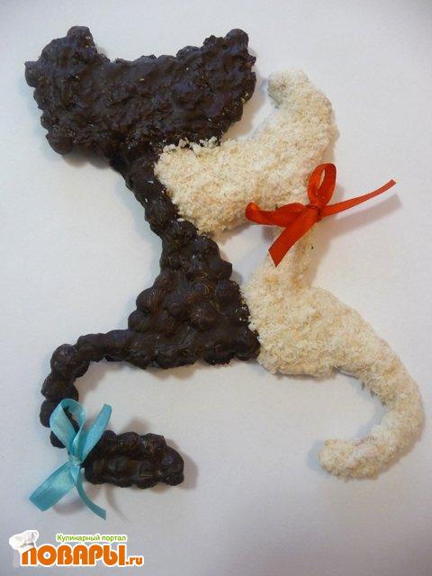 Растапливаем в микроволновке тёмный шоколад (1 минуты достаточно при мощности 900). Окунаем в него шоколадные шарики и делаем "кота". Оставляем застыть.