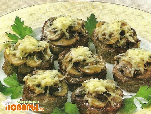 Перед самой подачей, удалив нитки, уложите медальоны на противень, сверху положите жареные грибы, посыпьте сыром и запекайте до тех пор, пока сыр не расплавится.