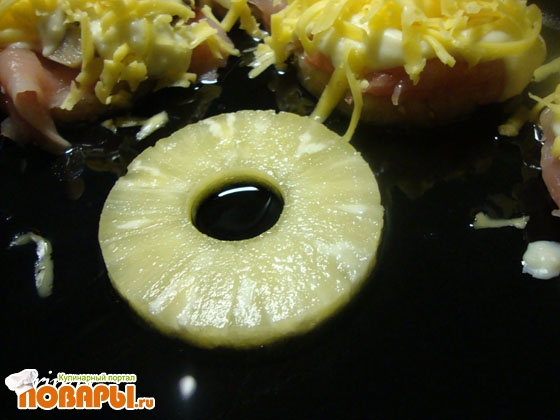 Сверху на ананас положить кусочек подсоленного куриного филе: