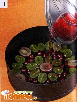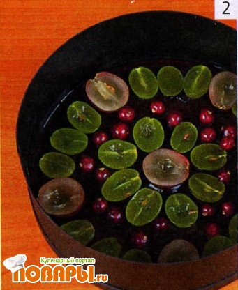 У нас получилась плоская композиция, но если захочется еще больше удивить своих гостей, то можно поступить следующим образом. Подготовленные фрукты (веточки винограда и т.д.) обмакнуть в полузастывшее желе и расположить в центре, стараясь не закрыть плоский узор из фруктов. Затем с помощью чайной ложечки аккуратно нанести на фрукты еще один слой желе.