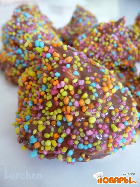 Растопить на водяной бане шоколад, покрыть им меренги и посыпать разноцветной присыпкой.