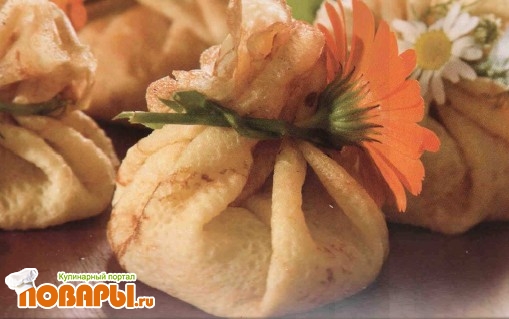 В центр каждого блинчика выложите начинку, придайте ему форму мешочка, закрепите стебельком мяты или мелиссы. При подаче посыпьте блинчики сахарной пудрой.