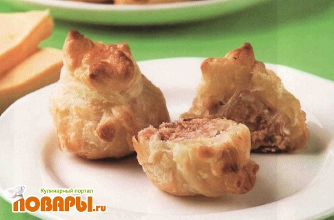 Тесто нарежьте небольшими квадратиками, на середину каждого уложите немного начинки, края соберите над начинкой и защипните так, чтобы получились «мешочки». Выпекайте их 15-20 минут при 180 °С.