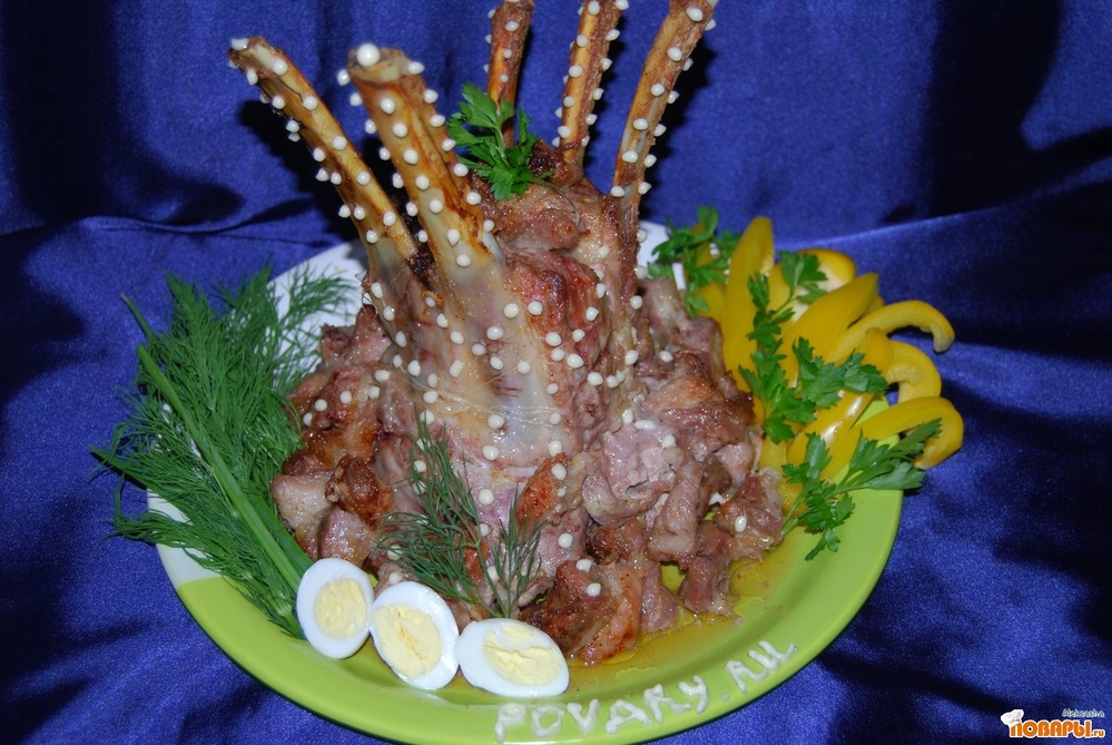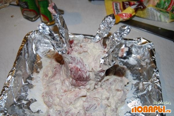 Далее берем ребрышки и соединяем их ниткой во внутрь ложем кусочки мяса чтобы ребрышки раскрылись как можно больше и были похожи на корону, по бокам выкладываем оставшееся мясо. Косточки заворачиваем в фольгу чтобы не подгорели.