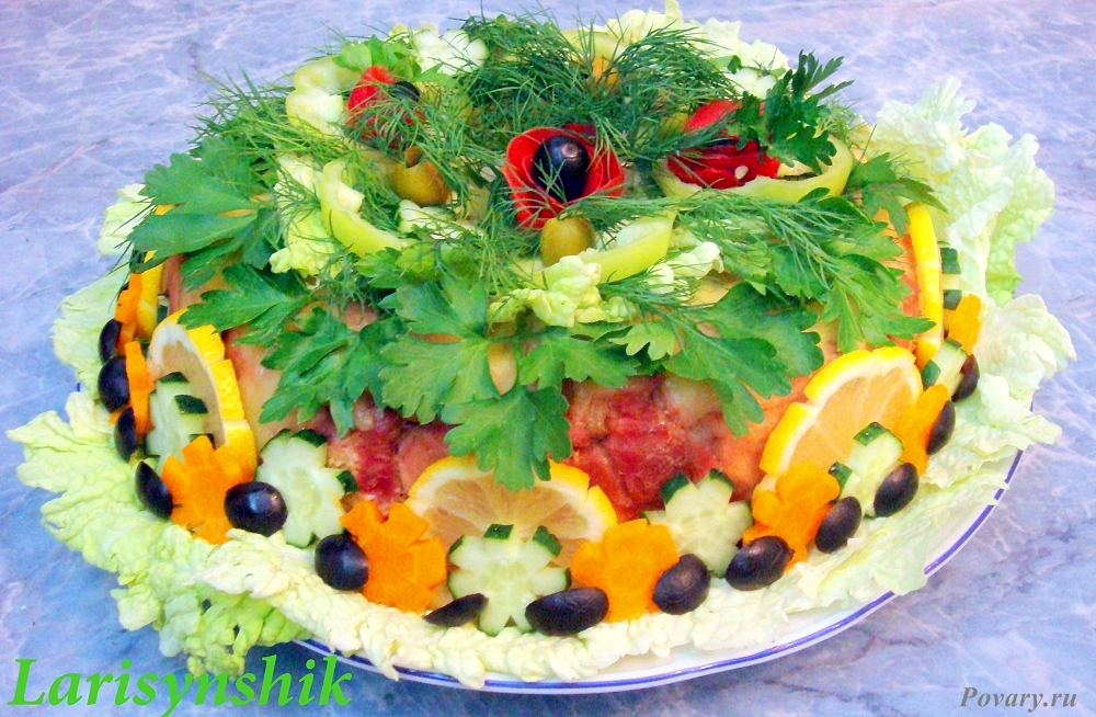 Готовый мясной калач украсить зеленью и овощами.